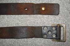The Belt, waist (Mark I.) Brown leather was approved on 8 August 1901 and announced as part of the Accoutrements, naval, Pattern 1901 by List of Changes paragraph §11110 of 1st July 1902. It was described as being similar to the Belt, waist for cutlass (L. of C. §§3969, 5138). The Belt, waist (Mark I) is of simple construction and of much thinner leather than the previous accoutrements. A flat brass, single tongued buckle is riveted to one end with a leather loop riveted 6-inches away and the free end rounded to a point. At around 48-inches long by 2-inches wide they appear to have come in only one size. (The Belt shown in the Set Display has been shortened at some stage.) The most recognisable feature of the Belt is the line of adjustment holes that run along its centre line, at around 1 ½-inches apart, for almost its full length. These perform the dual functions of length adjustment and securing the hooks of the Braces. The example above left is dated 1902 and is by a Birmingham maker (name illegible). From the Graham Tweeddale Collection. Photographs © Graham Tweeddale 2011.