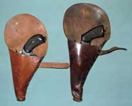 At left are side-by-side photographs of a Case, pistol. (Mark II.) and (Mark. III) along with typical Pistols, Webley (Mark. IV) and (Mark VI.) for comparison. The Mark II Case is the Riley & McCormick example described above while the Mark III Case is completely unmarked except for a lone broad arrow over 46 under the flap, which is presumed to be an inspector’s mark. Photographs © Karkee Web 2011.