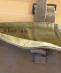 This interesting variant is identical to the first issue Entrenching tool carrier issued withW.E. Patt. '37 , except that is has 2-inch buckled chapes instead of the 1-inch ones found on Pattern '37. The Implement, intrenching, Patt. ’08, was reintroduced by L. of C. §B5409 in 1941, as the Implement, entrenching, Patt. ’37, after having been declared obsolete in 1923. This Carrier, identical to the Patt. '37 except for the 2-inch buckles, would seem to be a logical requirement for troops still using W.E. Patt. '08. This example is maker marked "BAGCRAFT LTD." and dated 1941. From the Karkee Web Collection.