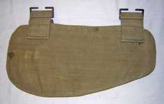 This was a standard Mark I, but fitted at just under half-height with a patch holding Hooks, brass, 3 inch. In place of the Buckle, brass, 1 inch, with loop (a 4-bar buckle) a new fitting was fitted, in order to accommodate the 2-inch wide ’08 Brace. The nomenclature of this new buckle (again 4-bar) is unknown, as it did not appear in Army Vocabularies. Extrapolating the Patt. ’37 term, it would be a Buckle, brass, 2 inch, with loop. The chape for this had to be correspondingly wider, so was in 4-inch webbing, folded in half, withthe edges folded in to create a waisted section for the buckle. The chape was then stitched into place, forming a wide fairlead, so that it functioned in exactly the way of a Pattern ’37 version. Closure, with a press fastener on a tab, was unchanged. The 1-inch wide loop on the buckle provided an identical connection for the Hook, brass, haversack, left, or -right fitted on the standard Patt. ’37 Straps, shoulder haversack. This example is maker marked "MW&S Ltd." and dated 1938. From the John Bodsworth Collection. Photographs © John Bodsworth 2012.
