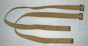 I've not located an original pair of W.E. Patt. '13 Straps, supporting pack. From the description in C.L.C. No. 1203, though, they are 27 1/2-inches long and 1-inch wide, with a Twigg buckle at one end and an eyeleted brass tip on the other; in other words identical to the W.E. Patt. '08 Straps, supporting. The picture at left shows a pair of Patt. '08 Support straps. These are maker marked "M.E. Co." and dated 1912. From the Karkee Web Collection.