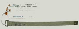 The Web Equipment, Naval, Pattern 1919 Haversack straps were introduced with the Pattern 1919 Naval Web Equipment in List of Changes L. of C. §23254, dated 2nd October 1919. These web straps are 3/4-inch wide by 13-inches long, with a brass tab on one end and a rectangular loop on the other. They are used to support the Pattern 1919 Haversack from the Brace attachments when the Haversack is worn on the back. At other times they are carried strapped to the bottom of the Haversack. The photo far left, of a sealed working pattern of the Haversack strap, is from the Carl Woods collection, photograph © Carl Woods 2008. The photo near left, of a pair of Straps, is from the John Lamont Collection, photograph © John Lamont 2010. It is interesting to note that, although both examples are undoubtably genuine, they have different styles of brass loops. None of these Straps is maker marked or dated, although all three were almost certainly made by M.E. Co. The pair is associated with an early, 1920 dated Patt. '19 Haversack, and so may represent the earlier variation. See the W.E. Pattern 1919 Haversacks and Packs page for details and pictures of the Straps in use with the Haversack.