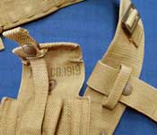 The Web Equipment, Pattern 1919 Cartridge carriers are mirror images of each other, and connect to the Strap, back adjustment. Each Carrier has four pockets, and each pocket holds 15 rounds of .303-inch ammunition in three 5 round chargers. These Carriers are similar to the later W.E. Patt. '25 Cartridge carriers, but have a distinctive outside retaining strap that makes them obviously different from the later pattern. Also notice the fastener spigot at the rear of the left Carrier. This was there to locate the Frog so that it would not "float" free on the Back adjustment strap. This feature would also be used on the later W.E. Patt. '25 Cartridge carriers. This type of Carrier was never adopted by the British Army, but was used by some Colonial military organisations such as the West African Frontier Forces. These Carriers are maker marked "M.E. Co." and dated 1919. From the Brian J. Burns Collection. All photos this section © Brian J. Burns 2009.