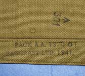 Rog Dennis's first comment was Who was anticipated as being so thick, that they'd need the word PACK stencilling on? We also wonder about the meaning of "OT". Ed Storey has suggested "Old Type", as a reference to it's being a holdover from '08 Pattern W.E., but the more usual abbreviation for this was "OP" for "Old Pattern". The most noteworthy thing about this stamping is that is the earliest example we've seen, by three years no less, of the stores code being marked on a piece of web equipment. With that in mind, it seems possible that the unusual addition of "PACK ... OT" is simply the result of a manufacturer trying to come to grips with a new requirement.