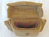 The Pouch, ammunition, pistol, W.E. Patt. ‘37, was an exact replica of the Compass pocket, with the felt lining omitted. It was intended to carry 12 rounds of .38-in. ammunition and could be connected to the Case, pistol in the same way as the Case, binoculars and Pocket, compass were. The connected assembly was often worn with the Pouch hooked to the belt, the Pistol case hanging lower down. The khaki blancoed example shown here is maker marked "M.E. Co." and dated 1939. From the Karkee Web Collection.
