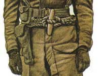 Another design has been noted, nomenclature and stores code unknown. This is similar to Patt. 37, but is closed with two press studs. Since the flap is square to the body, it is assumed to contain an automatic pistol. It is shown suspended from a Patt. ’37 Pistol ammunition pocket, so the rear of the Holster must be fitted up as Patt. ’37. This detail has been noted in a painting made from a photograph of a Free French Commando. KW would welcome details of the original photo or, better yet, an actual example!