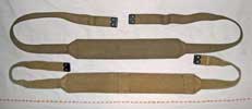The Braces are different in some ways from the British M.E. Co. designs. Overall, these are several inches shorter and the 2-inch wide center section is longer. Also note the U.S. style brass connector sewn inside the crossover loop. The right Brace passes through this as well as the crossover loop. On the outside view (far left), you can see the transverse web loops on the wide part of the Brace. The Strap, with keyway fitting, passes through these. The end with the transverse loop is at the rear of the Brace.