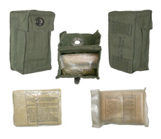 A soldier’s First Aid, right back to the Boer War, comprised just a First Field Dressing. With the introduction of drab Service Dress in 1902, a pocket was sewn inside the right skirt corner of the S.D. Jacket. When Battle Dress was introduced in 1938, an external pocket on the right B.D. Trousers’ leg contained the same dressing, often of Great War dates too! American soldiers carried a webbing pocket on their accoutrements, which contained a Carlisle Dressing, akin to a First Field Dressing. It fell to the U.S. Marine Corps to provide a larger First aid pouch, containing far more items. In the British Army, the U.S.M.C. approach took rather longer. From the Rog Dennis Collection. Photos © Rog Dennis 2012.