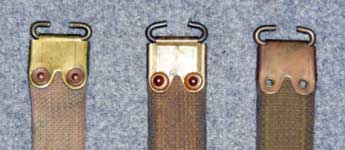 A comparison of the New Zealand "Pattern 1913" Rifle sling (near right ) and a standard second issue G.S. Mk. I sling (far right). You can see the blackened end fittings on the New Zealand issue Sling. The "Pattern 1913" Rifle sling is the 1914 M.E.Co. one shown at left. The second issue G.S. Mk. I example is maker marked “M.E.Co." and dated 1915. All from the Karkee Web Collection.